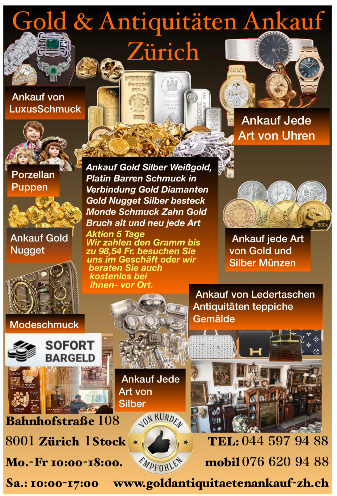 Wir beraten Sie auch gerne bei Ihnen vor Ort kostenlos bis 120 km oder besuchen Sie uns in unserem Geschäft, Bahnhofstraße 108 inZürich -1Stock Wir kaufen jede Art von Gold, Silber Platin